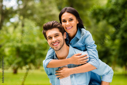 Photo of cute pair having fun together walking summer green park outdoors wear denim outfit