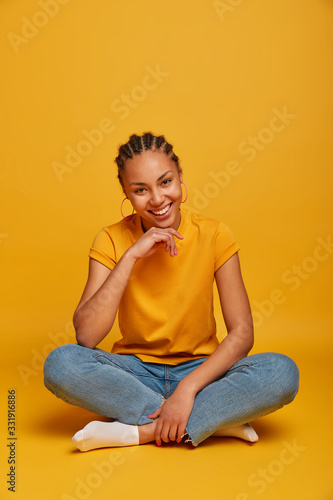 Photo of delighted woman smiles toothily, wears casual clothes, being in good mood, feels satisfied emotions, sits in lotus pose, has pleasant talk, isolated on yellow background, empty space above