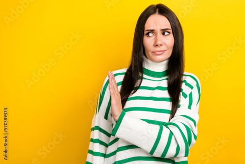 Photo of doubtful unsure lady dressed striped pullover rising arm palm looking empty space isolated yellow color background