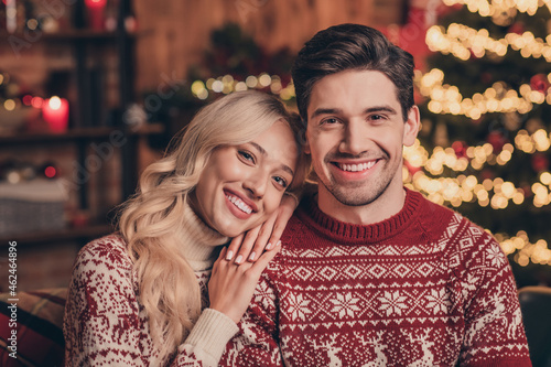 Photo of dreamy adorable young wife husband wear print sweaters smiling embracing enjoying noel time indoors house home room
