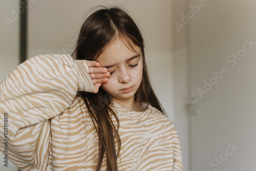 Photo of Expression of lonely female teenager at home. Pensive teen. A pretty teenage girl covers her face with her hands. Depression, teen depression, pain, suffering, mental health