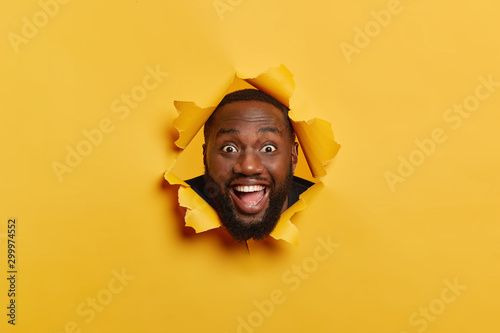 Photo of happy black man with pleased face expression, dark bristle, has fun indoor, keeps head in torn paper hole, laughs and looks at camera, isolated over yellow background. Face expression