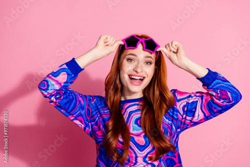 Photo of lovely young woman touch sunglass open mouth wear pullover isolated on pink color background