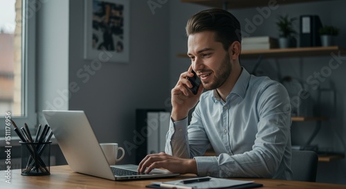 Photo of Man Talking on Phone While Using Laptop At Office