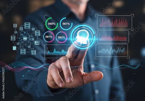 Photo of man touching a futuristic ai interface with data analytics and charts