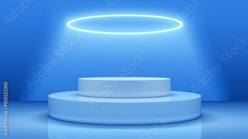 Photo of Modern blue product display stand with neon light, perfect for showcasing products or designs in a minimalist setting