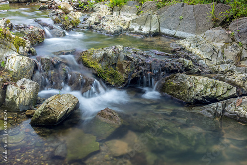 Photo of nature - Long exposure of a mountain stony creek inside in the forest. Small mountain rocky river.