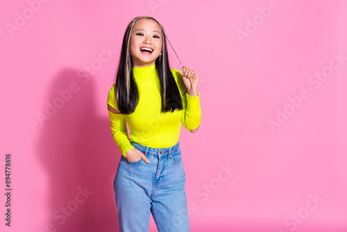 Photo of nice pretty positive girl with dyed hairdo dressed yellow turtleneck arm in pockets hold braid isolated on pink color background