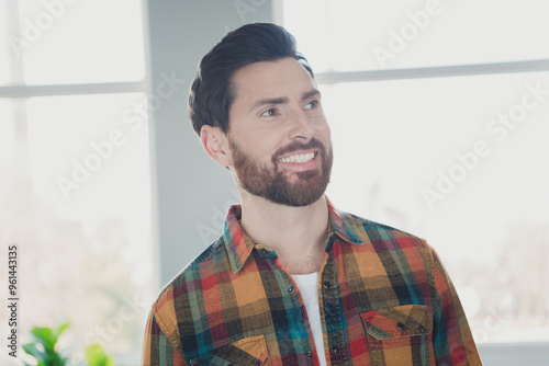 Photo of nice young man look interested empty space wear stylish checkered shirt modern light cozy interior flat indoors