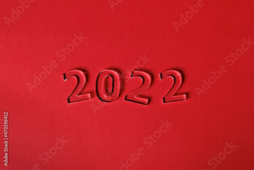 Photo of numbers 2022 made of volumetric transparent acrylic glass on a red background. Selective focusing.