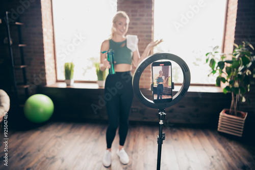 Photo of positive girl coach having mobile phone online blogging recording stream in house indoors