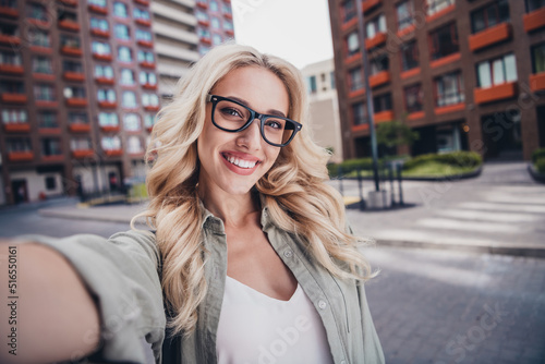 Photo of positive gorgeous person take selfie record video toothy smile walk enjoy nice weather outside