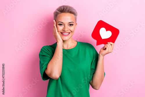 Photo of positive pretty lady hand touch cheek hold paper like notification card isolated on pink color background