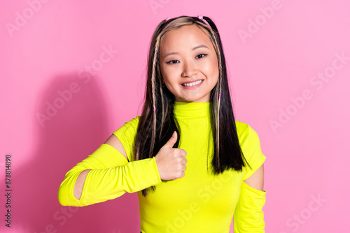Photo of satisfied girl with dyed hairstyle dressed yellow turtleneck showing thumb up good work isolated on pink color background