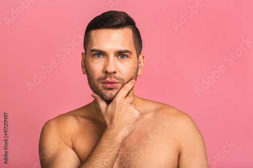 Photo of smiling young beautiful man standing isolated over pink wall background naked. Man's skincare concept in a bathroom.
