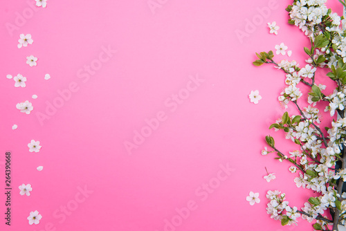 photo of spring white cherry blossom tree on pastel pink background. View from above, flat lay