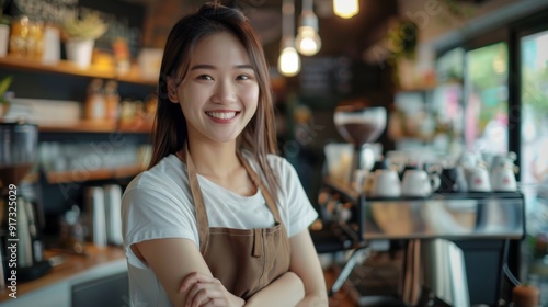 Photo of successful small business owner starting a SME business, beauty blogger girl online marketing video in a coffee shop, asian woman coffee shop owner barista, SME entrepreneur, blogger