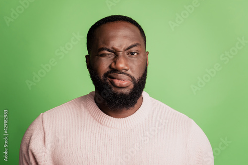 Photo of suspicious man close eye grimace look camera wear white shirt over green background