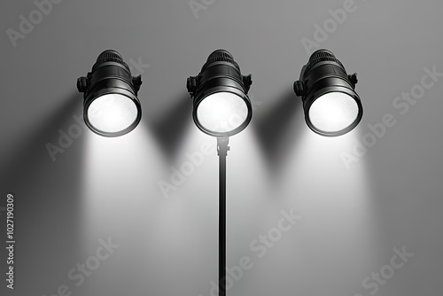 Photo of three spotlights on a grey background, a vector illustration with a white and gray color scheme, a minimalist design