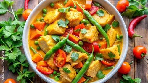 Photo of vibrant chicken curry with fresh vegetables like peas, carrots, tomatoes, and green chilies in a creamy sauce