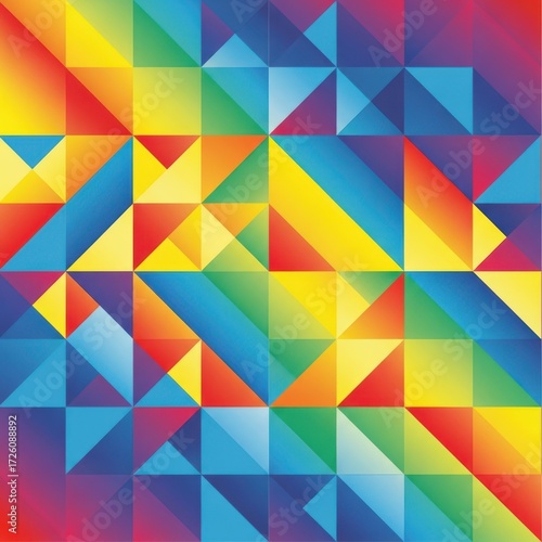Photo of vibrant geometric abstract pattern with rainbow gradient triangles and squares