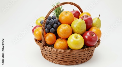 Photo of Wicker Basket Overflowing With Fresh Fruit on White Background