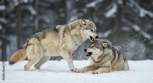 Photo of Wolves Interacting During Winter in a Snowy Forest Setting