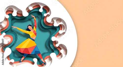 Photo of woman performing traditional dance in colorful costume, artistic paper cut design