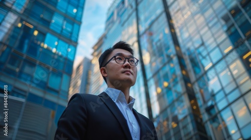 Photo of young Asian businessman with glass building background