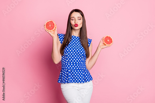 Photo of young attractive woman happy positive smile poutd lips hold citrus grapefruit isolated over pastel color background