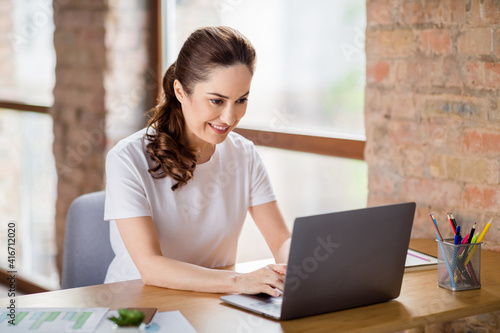 Photo of young beautiful happy cheerful smiling positive businesswoman remote working in laptop at house home