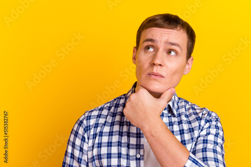 Photo of young handsome guy hand touch chin dream think look empty space isolated over bright color background