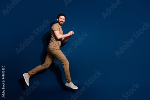 Photo of young jumping guy brunet hair model in beige t shirt using jumping with phone running isolated on dark blue color background