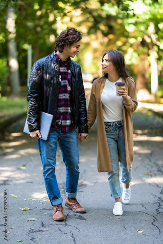 Photo of young loving couple students outdoors outside at street walking drinking coffee talking with each other.