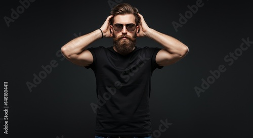 Photo Portrait Bearded Man in Black Shirt and Sunglasses on Dark Background