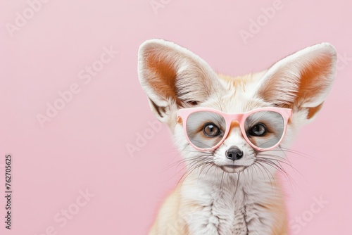 photo portrait of a fennec fox wearing pink glasses on a pastel pink background. There is empty space for text on the left