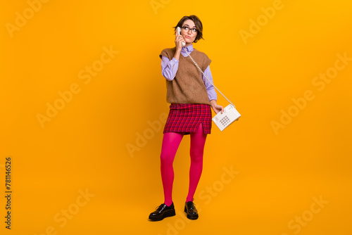 Photo portrait of attractive young woman moody look empty space phone call dressed retro office clothes isolated on yellow color background