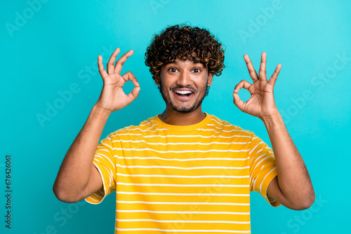 Photo portrait of handsome young guy showing excited okey sign dressed stylish striped yellow outfit isolated on cyan color background