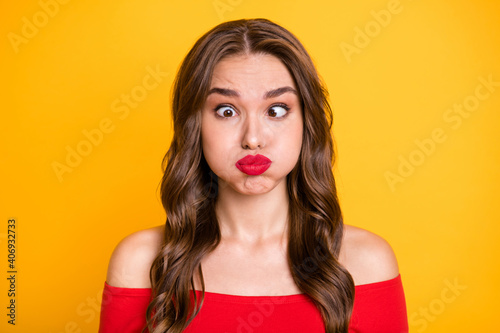 Photo portrait of pretty model grimacing fooling keeping air in cheeks isolated on vivid yellow color background