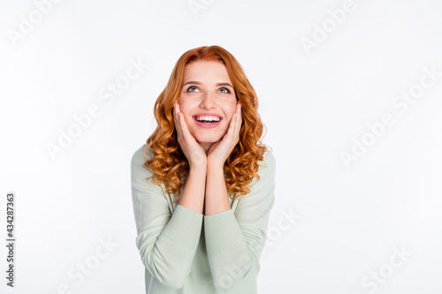 Photo portrait of red haired young girl looking blank space smiling touching cheeks amazed isolated on white color background