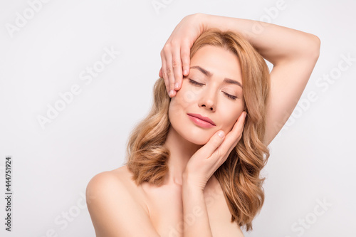 Photo portrait woman dreamy enjoying skin care procedures after shower isolated white color background