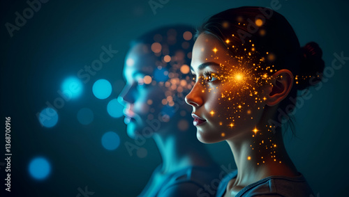 Photo Realistic Double Exposure of Person with Smart Lighting Control & Tech Symbols for Intelligent Management