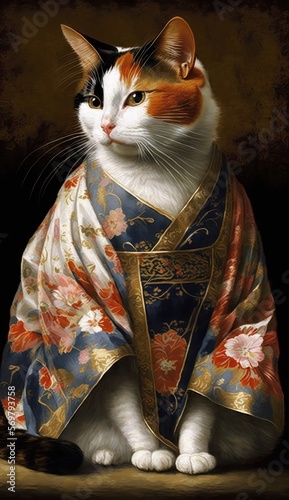 Photo Shoot of Unique Breathtaking Cultural Apparel: Elegant Japanese Bobtail Cat in a Traditional Japanese Kimono with Obi Sash and Beautiful Eye-catching Patterns like Men, Women, and Kids