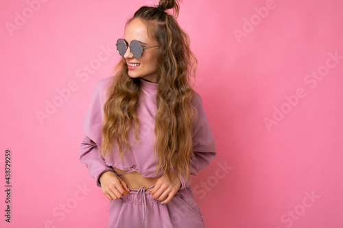 Photo shot of beautiful young dark blonde woman wearing casual clothes and stylish sunglasses isolated over colorful background looking to the side