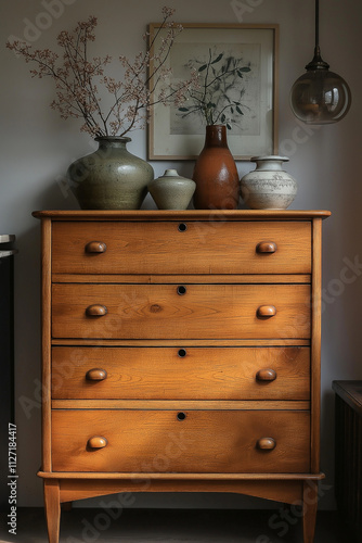 Photo studio d'une commode en bois naturel avec finition soignée et design élégant, sur fond blanc