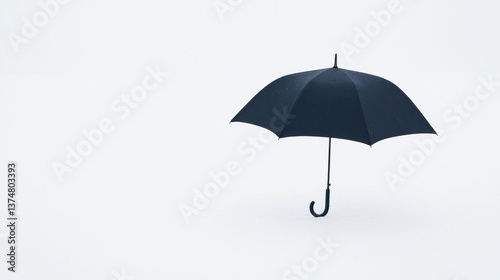 Photograph of a black umbrella with a curved handle. the umbrella is open and appears to be floating in the air. the handle is made of metal and is attached to the top of the umbrella.