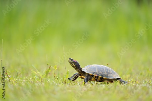 photograph of a Japanese pond turtle resting calmly on a natural stone surface surrounded by soft grass.