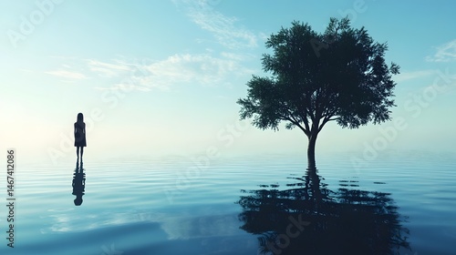 Photograph of a lone figure and tree reflected in calm, shimmering water under a pale blue sky.