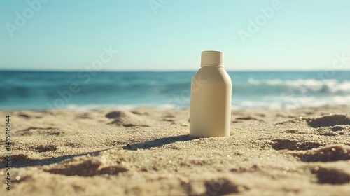 Photograph of a plastic bottle rests on a sandy beach with a blue ocean backdrop.