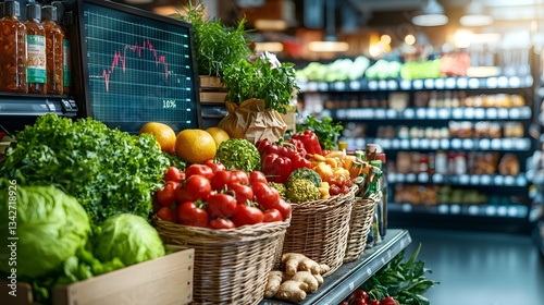 Photograph of a premium grocery store section featuring organic products with a semi transparent market chart overlaying the scene to indicate price trends The image offers clean